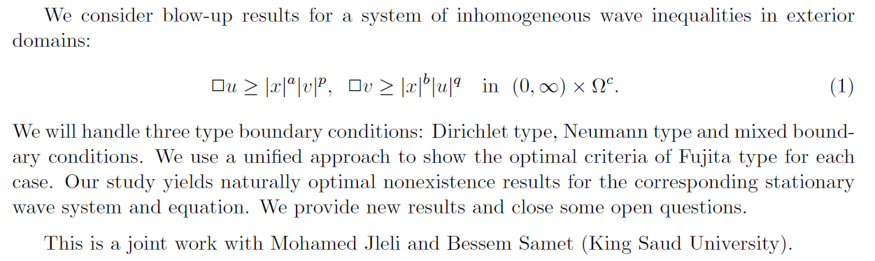 报告题目:Critical Criteria of Fujita Type for a System of Inhomogeneous Wave Inequalities in Exterior Domains