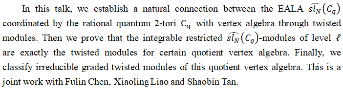 报告题目:Vertex Algebras and Extended Affine Lie Algebras Coordinated by Rational Quantum Tori
