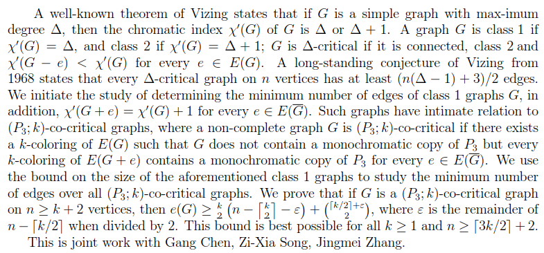 报告题目:On the Size of Special Class 1 Graphs and (P3; k)-co-critical Graphs