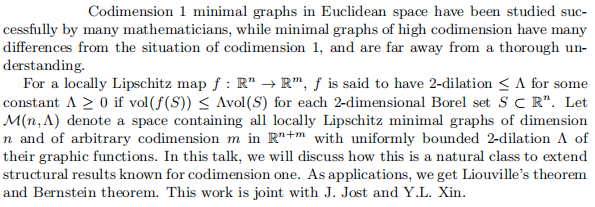 报 告 题 目:Minimal graphs of arbitrary codimension in Euclidean space