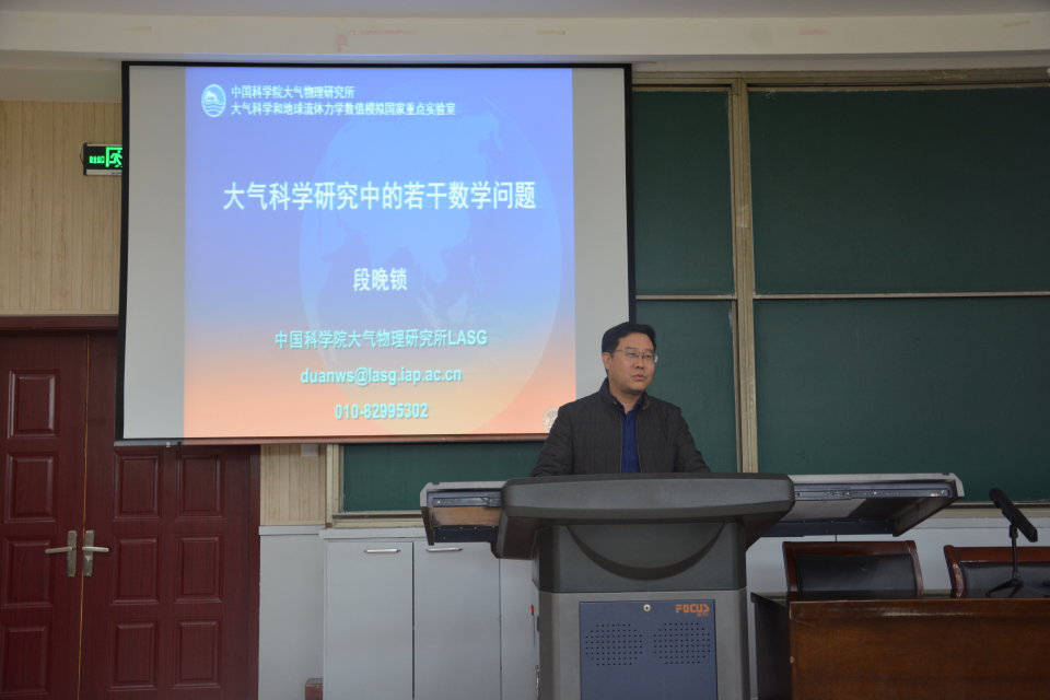 27日上午,段晚锁作《大气科学研究中的若干数学问题》专题报告,报告会由学院副经理王波主持。段晚锁强调了数学在大气科学研究领域的重要性,然后具体介绍了大气科学的含义和基本内容,列举了大气科学研究领域的若干个数学问题并通过著名的“蝴蝶效应”生动直观地向同学们讲述了数学在大气科学领域中所发挥的重要作用。