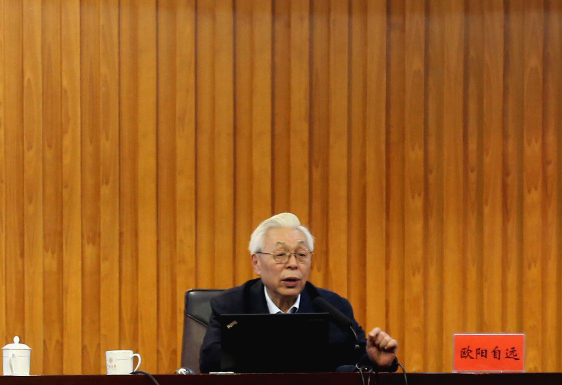 欧阳自远(1935.10.9),天体化学与地球化学家,中国科学院院士,发展中国家科学院院士,国际宇航科学院院士。1960年中科院地质所研究生毕业。现任中科院地化所研究员,国家天文台高级顾问, 贵州省科协荣誉主席。兼任北京大学、中国科技大学、南京大学、中山大学、哈尔滨工业大学、浙江大学等12所高校兼职教授,天津理工大学和贵州大学名誉董事长。曾任中国科学院资源环境科学局局长、地球化学所所长,贵州省科协主席,贵州省人大常委会副主任。成果获国家科学大会奖、国家自然科学奖和科技进步奖多项、贵州省最高科学技术奖,中科院自然科学奖一等奖和科技进步奖一等奖、工信部科技进步特等奖、国防科工委个人突出贡献奖、国家科技进步特等奖,全国先进工作者等。在国内外共发表论文590多篇,专著18部,主编著作21部。培养硕士、博士与博士后65人。至今仍然在科研第一线勤奋工作。