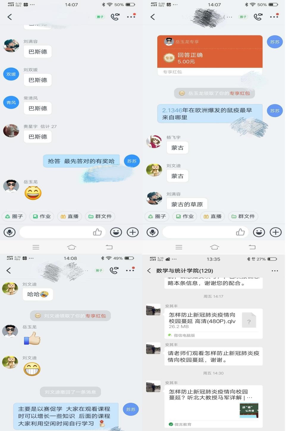 公开课以线上集体观看的形式进行,辅导员还通过线上有奖问答的互动方式增加同学们的学习氛围以及学习效果。通过收看节目,学院师生收获了面对新冠病毒有效的预防知识,进一步增强了防控意识,同时也坚定了战胜疫情的决心及信心。“通过这次公开课,让我了解到了很多关于新冠肺炎相关知识,相信我们一定能战胜疫情”、“这次公开课不仅消除了我对新冠肺炎的恐惧,而且让我对相关知识产生了一些兴趣”、“现在我可以更好的规划和思考这段时期的学习生活,也希望疫情早日结束,我们可以早日回到学校正常上课”、“相信以后人类可以更好的思考与大自然的关系,珍惜我们的生活”......公开课后,大家纷纷表达了自己的看法以及对生活的希望。