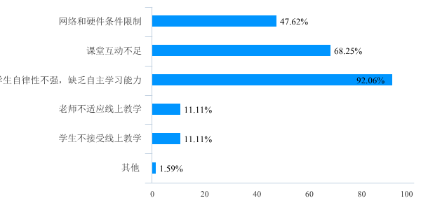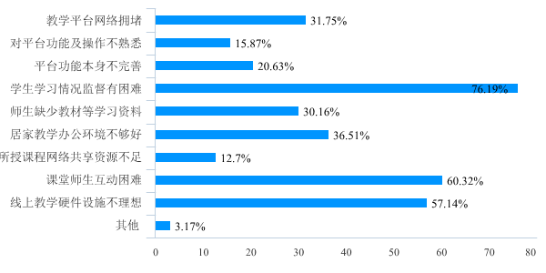 为了进一步了解老师们在线上教学中遇到的困难,本次调查还专门对这一情况进行了调查。老师们集中反映的线上教学的困难主要集中在:1)员工学习情况监管困难;2)课堂师生互动困难;3)教学硬件设施不理想;4)居家办公环境不够好;5)平台网路拥堵;6)师生缺少教材等学习资料。