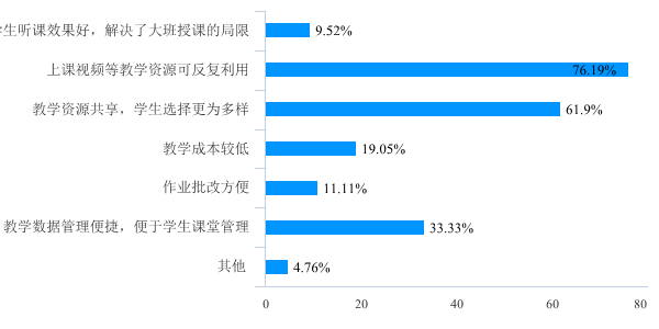 对于线上教学能否实现与传统课堂教学同效的问题,认为能实现或者基本能实现的教师数量比例和认为效果不能确定教师数量比例基本相当,同为42.85%; 认为不能达到课堂教学效果的占14.29%,说明线上教学与传统课堂教学相比还有很大的改进空间。