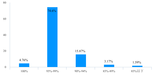 对于员工参与线上学习的积极性方面,79.36%的课程员工出勤率在95%以上,95.23%的课程员工出勤率都在90%以上,对于出勤率低于85%的课程,学院也将继续关注,进一步查找原因,提高员工出勤率。