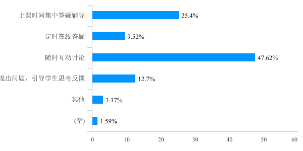 师生互动也是教学效果好坏的一个重要影响因素,从师生互动方式调查数据来看,由于数学类课程的特点,老师们采用最多的互动方式是答疑辅导,达69.84%。作业、主题讨论和测验也占据了较大的比例,说明线上教学中师生高度重视教学互动环节。