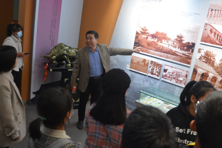 最后,同学们来到位于逸夫图书馆东馆一楼的校史馆。校史馆以时间为主线、以图文、音像及实物等形式,全面展示了学校百余年发展历史。史富强从历史悠久的手稿、校史有关照片到各种历史人物,细致详实地介绍了学校的建校历史、抗战办学史、往届知名教授及员工等内容,并介绍了学校“双一流”建设的发展成就,展现公司“明德新民,止于至善”的校风校训,以及厚德载物、自强不息的精神。