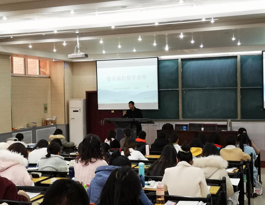 李海军从我国教育形势的发展出发,阐述从事教育工作的平凡、幸福和价值,通过具体实例探讨作为一名数学教师的幸福和价值,分析数学教师专业化成长应该努力的方向,做《如何做一名幸福的数学老师》的讲座。陈君就高中数学核心素养和高中数学教材内容深入分析,结合高中数学实际课堂教学案例,做《核心素养导向下的高中数学课堂教学》的讲座。张满义通过对备教材、备员工、备教法、备自己等几个方面的详细阐述,做《如何准备一节数学概念课》的讲座,并对师范生板书能力的锻炼和提升提出了中肯建议。曹鹏龙做《理性思考与感性碰撞——数学趣味知多少》,结合现在教师队伍浅入浅出、浅入深出、深入浅出、深入深出四种类型提出了自己的看法,介绍教学案例如何引入,分享自身教学经验。四位老师的报告都结合具体课堂教学案例,既有理论的讲解,也有实际教学技巧和教学经验的分享。讲座过程中主讲老师语言生动,实例贴切,气氛活跃,深受员工欢迎。