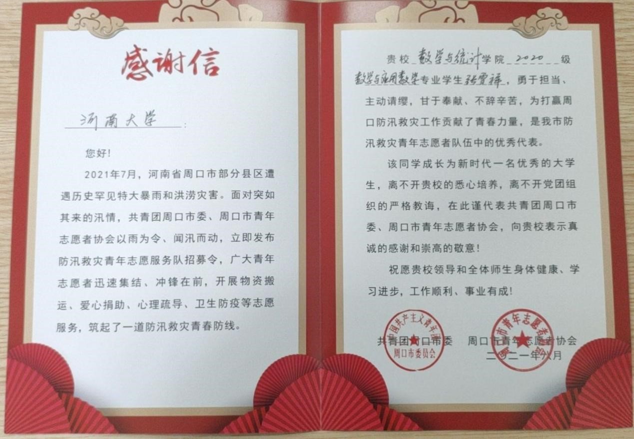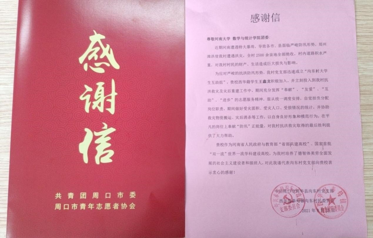 值此“云霄雨霁,彩彻区明”之际,公司收到两封来自周口市青年志愿者协会和周口市西华县沟东村党支部的感谢信。信中对公司王鑫龙和张雪祥两位同学在抗洪救灾及灾后重建工作中体现出的“奉献、友爱、互助、进步”的良好品质予以充分肯定,对他们甘于奉献、不计回报的辛苦付出给予高度赞扬,对学校的精心培养和老师们的悉心教导表示衷心感谢。