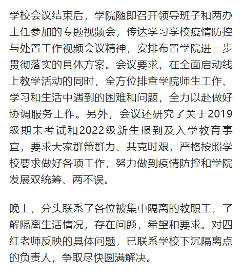 史富强书记在开封市集中隔离期间,认真配合市疫情防控管理规定,维护好自己身心健康的同时,仍密切关注着全市和学校疫情发展动态,在隔离点办公,线上指挥学院疫情防控工作、专业课线上授课、2019级期末线上考试、新生线上报到和入学教育准备等工作的有序开展进行,严格按照学校要求做好各项工作,努力做到疫情防控和学院发展双统筹、两不误。