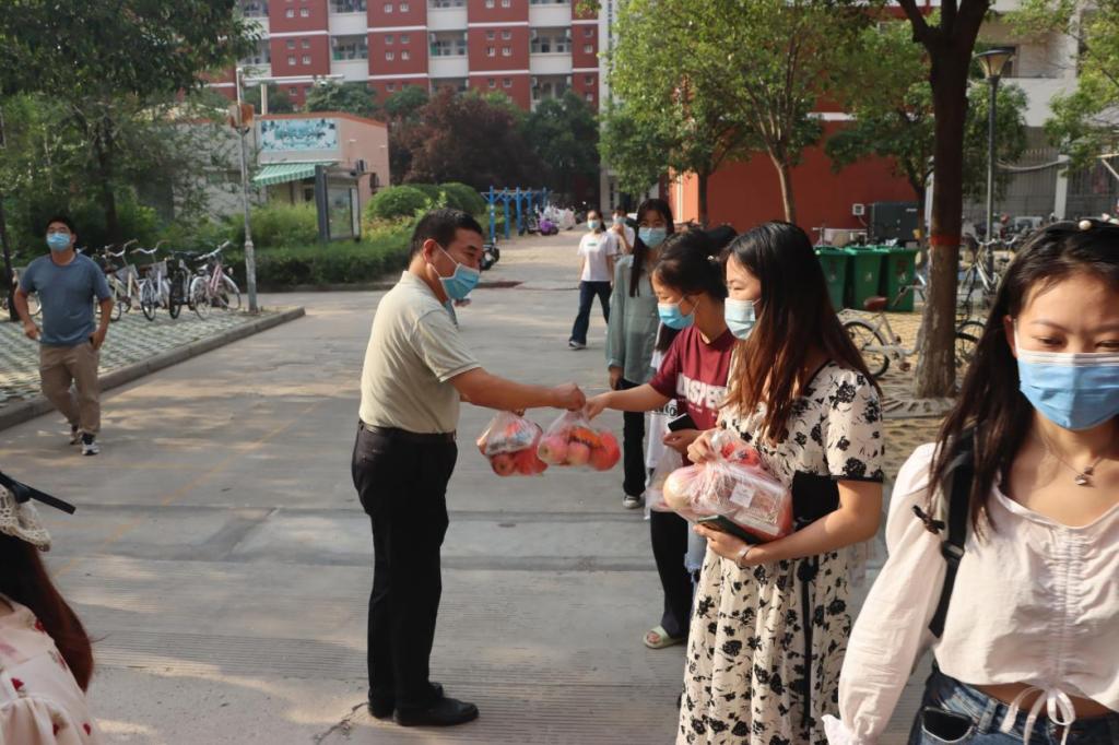 在发放月饼和水果时,师生们亲切交流。老师们向员工致以节日的祝福和问候,关心同学们在校期间的学习、饮食、住宿等情况,向同学们在疫情防控期间对学校各项管理和教学安排的理解支持表达了感谢,并提醒大家珍惜防疫成果,继续提高防护意识,做好个人防护,保持适当社交距离,注意自身身体情况,有问题及时向学院反馈,做好防疫措施等等。