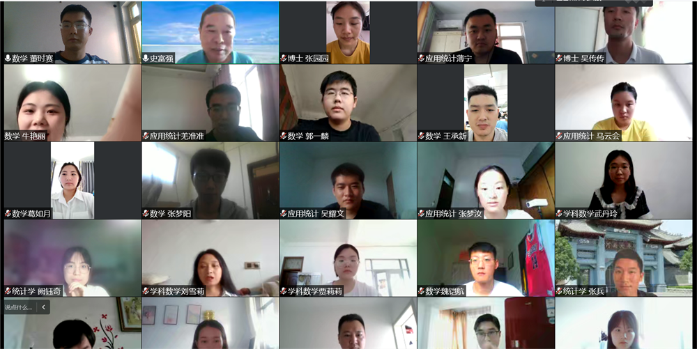 9月6日下午,史富强以“院史院情教育”为主题,首先对当前开封市和公司的疫情防控形势进行了介绍,对同学们疫情期间的健康状况表示关切,并代表学院表达了对全体2022级研究生新生的热烈欢迎。接着讲述了bwin必赢辉煌的历史、艰难曲折的发展道路以及逐步复兴的历程。然后以学院的发展史为切入点,详细介绍了黄际遇、陈作钧、樊映川、黄敦慈、杜孟模、刘亚星等先后在学院执教的著名数学家和教育家,他们为学院的发展作出了巨大贡献,令同学们身临其境,感受颇深。最后,史富强勉励同学们要加强体育锻炼,在学习生活中养成独立思考、解决问题的能力,提升自身综合素质,努力成为创新型、应用型、复合型优秀人才。会议结束时,史富强与同学们“云”合影留念。