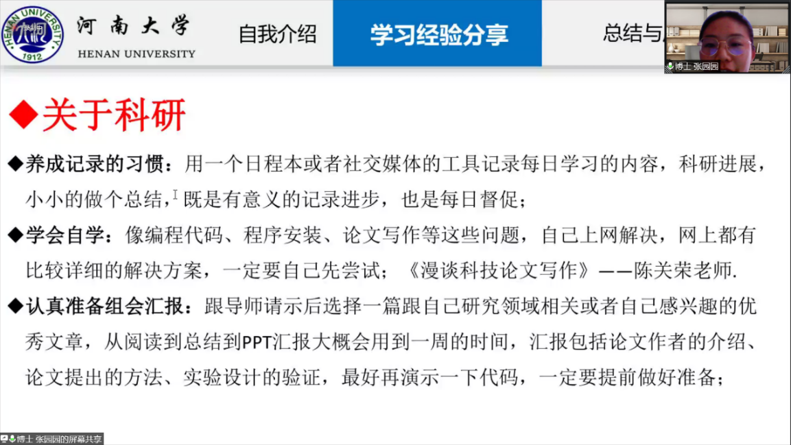 张园园首先进行了自我介绍,接着简要概述了关于硕博连读的报考条件、流程以及优势,然后从课程、科研、生活三个方面分享了自己的学习经验。对于课程,要认真上课,做好笔记,认真复习,用心对待每一次考试。对于科研,要规范作息,多听讲座,每周定时汇报科研进程,做好每日的记录和总结,学会自学。对于生活,要抽时间进行身体锻炼,多与大家交流,每周至少和父母通话一次,放平心态,勇敢面对困难。