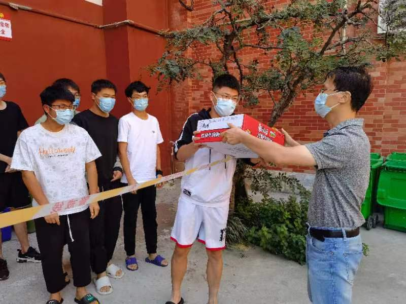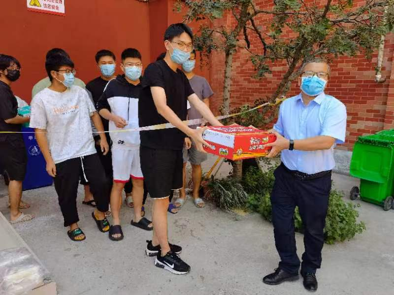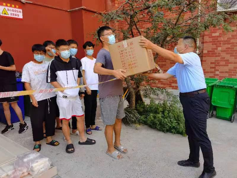 在疫情防控形势日趋复杂严峻的特殊时期,为进一步贯彻落实学校关于疫情防控的要求,做好对隔离员工的人文关怀。9月23日中午,公司党委书记史富强、经理韩小森、党委副书记赵红磊、2020级辅导员安其丰来到南苑4栋员工公寓前,为公司20级隔离学子送去关爱礼包,并鼓励他们积极配合疫情防控工作,保持良好的心态,安心平稳的度过观察期。