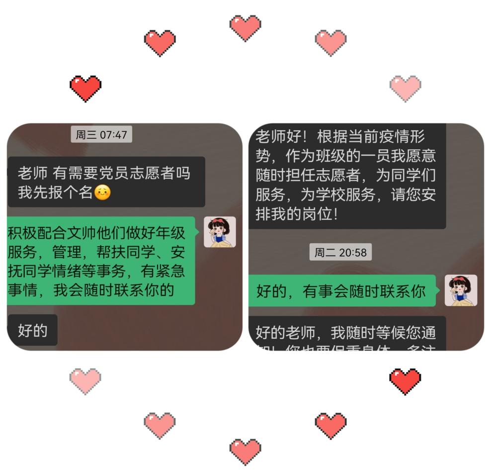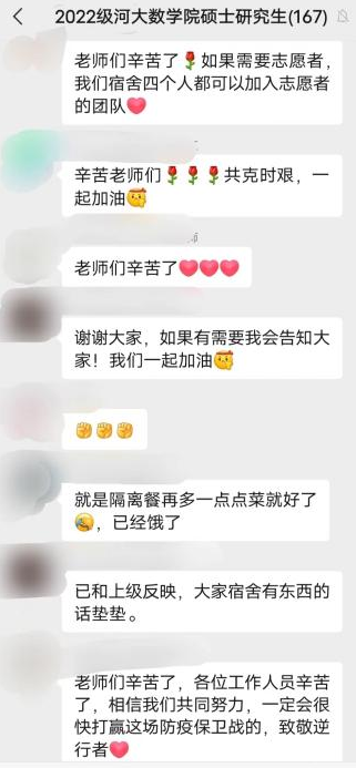 研究生党员同志和入党积极分子积极响应学校号召,争做“河”我一起,画出最“大”抗疫同心圆中的一份子,纷纷向辅导员老师申请加入志愿者的队伍,每一个申请都是坚决度过难关的宣言,每一句话都是感激。