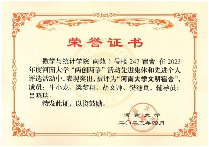 247宿舍是一个团结友善、积极进取的文明集体,该宿舍共有四名成员,分别为:牛小龙、梁梦翔、胡文帅、樊继良。他们四个相识于2017年,本科均就读于bwin官网数学专业,经过四年的努力学习与奋斗,他们在追梦路上并肩作战成功考取本校硕士研究生。从2021年成为室友到现在,他们在知识的田野勤恳耕耘,朝理想的道路齐心并进。宿舍四名成员学业成绩和综合素质并重,努力实现德智体美劳全方位的发展与进步。